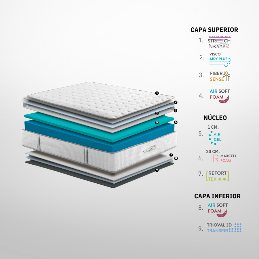 En su capa superior incorpora materiales como la viscoelástica Airy Plus, las fibras Fiber Sense y la espuma Air Soft, que se adaptan al cuerpo y alivian los puntos de presión. En el núcleo, una capa de Air Gel (1cm) aporta frescor, y la base de espuma HR Maxcell (20 cm) asegura un soporte firme y duradero. Todo esto reforzado con la tecnología Refortex.