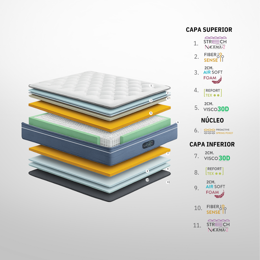 Incorpora en ambas caras un acolchado con 2 cm de viscoelástica y 2 cm de viscoelástica supersuave, cubiertos con tejido Stretch Nkama2, que aporta suavidad y transpirabilidad.