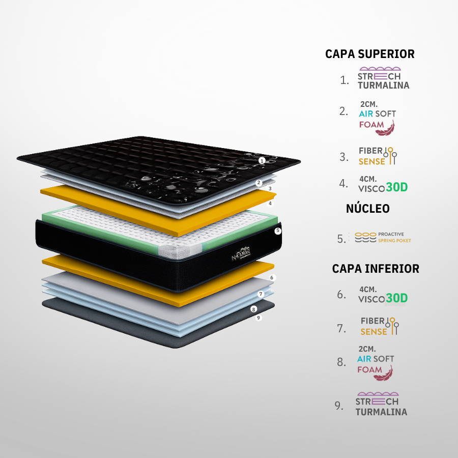 Descubre el equilibrio perfecto entre confort y tecnología con nuestro colchón duna. Su composición incluye tejido strech con turmalina, una tecnología pensada para ayudar a relajar el cuerpo y favorecer un descanso más reparador. Además, sus capas de air soft foam y fiber sense aportan suavidad, adaptabilidad y confort desde el primer contacto.